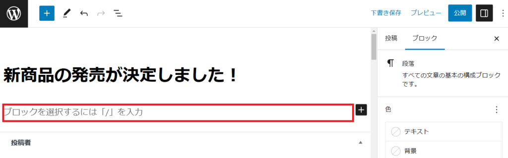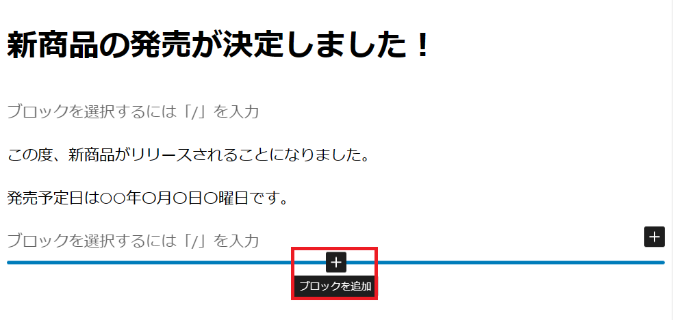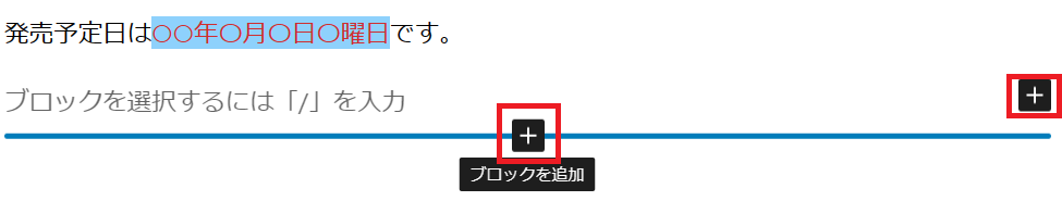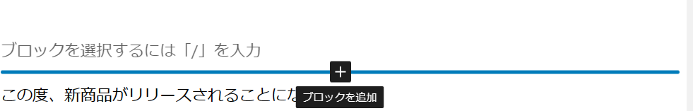記事を書く行の『ブロックを選択するには「/」を入力』と書かれている箇所の下部にマウスのカーソルを合わせると、『ブロックを追加』『+』というボタンがあらわれます(または右側の『+』)のでクリックします。