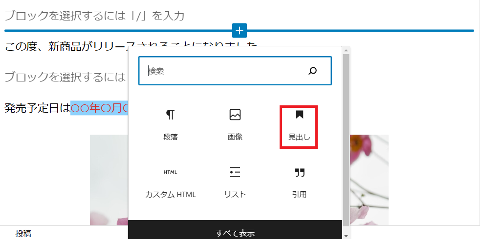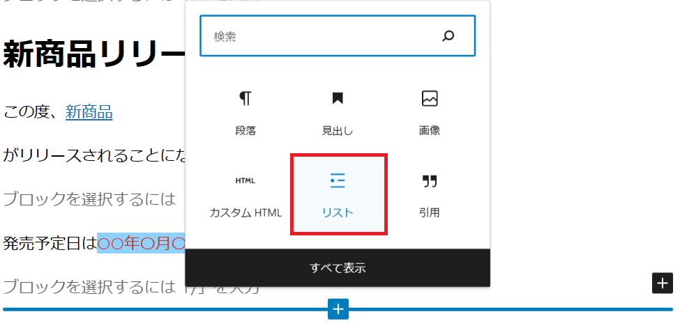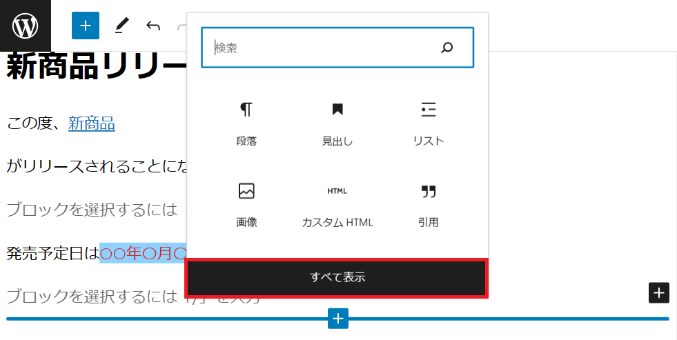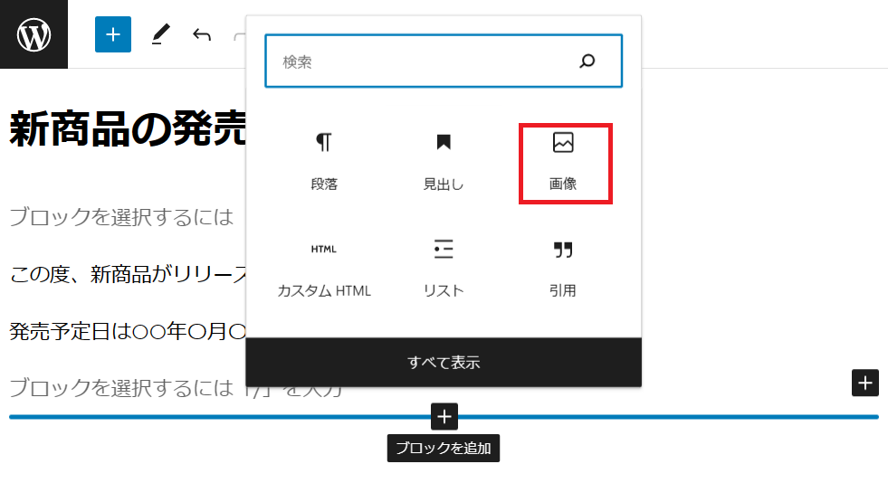 窓枠に作成したいブロック項目がない場合は、窓枠下にある『すべて表示』をクリックします。