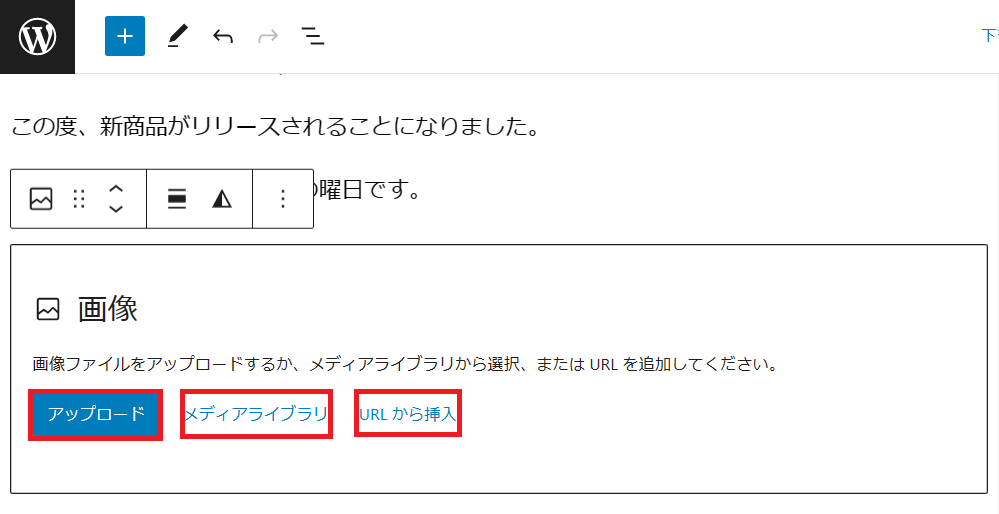 『画像』をクリックすると上図のように表示されます。画像ファイルを「アップロードする」か、「メディアライブラリ」から選択するか、「URLから挿入」する方法を選択できますので、どれかを選んでクリックして画像を挿入します。