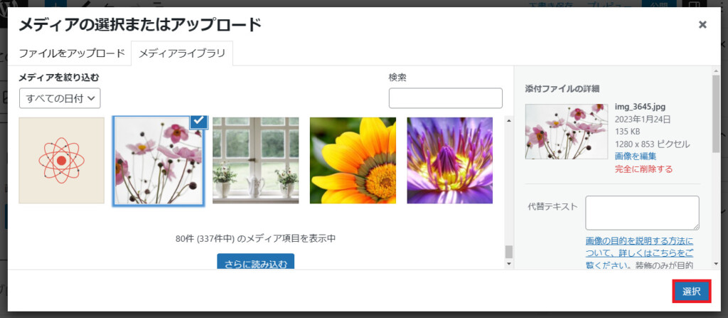 「メディアライブラリ」は、WordPress内に事前に保管しておいた画像を表示します。その中の画像をクリックして右下の『選択』ボタンをクリックします。