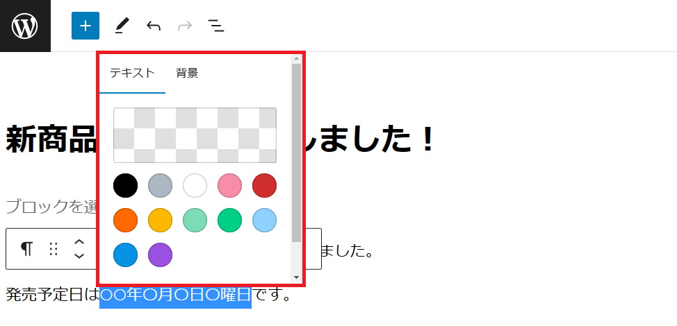『ハイライト』をクリックすると上図のようにカラーが表示されます。文字色自体を変えたい場合は『テキスト』でカラーをクリックします。背景色を変えたい場合は『背景』でカラーをクリックします。