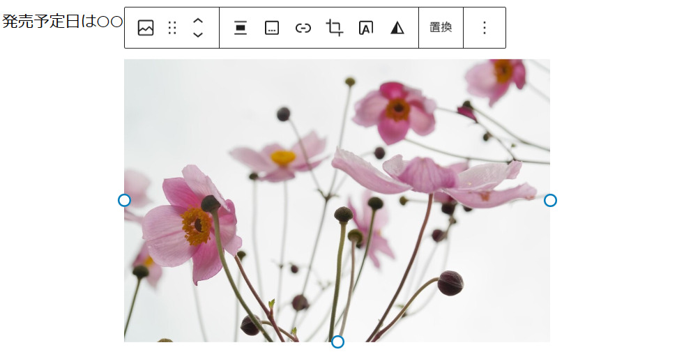 『選択』ボタンをクリックすると、上のように画像を挿入することができます。画像の端にある〇ボタンのドラッグによって、画像を引き伸ばしたり、縮めたりすることもできます。また、画像の上に表示されているボタンを使って「中央寄せ」や「トリミング」ができます。