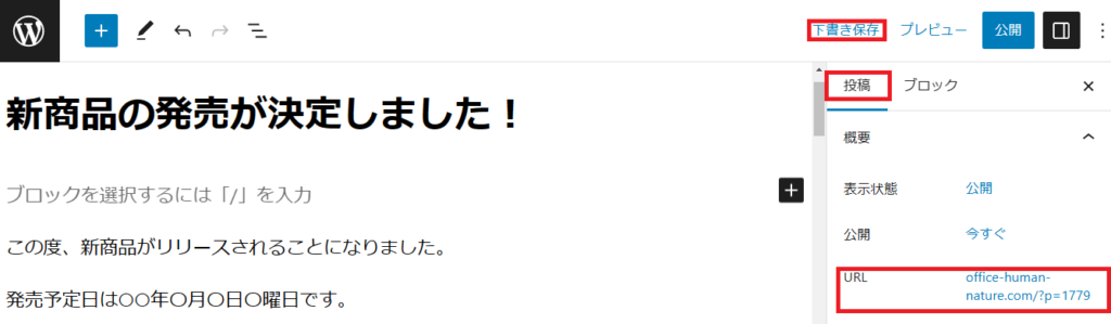 次に、記事のパーマリンクをローマ字で記述します。文章入力画面の右側の『投稿』⇒『下書き保存』⇒『URL』の順にクリックします。