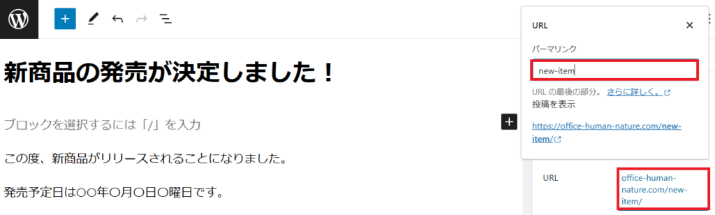 『URL』青色表示箇所をクリックして、日本語からローマ字に書き換えます。