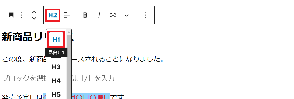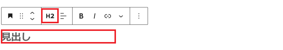 記事を書く行が『見出し』と表示されますので、文章を入力します。上に表示されている小窓の『H2』をクリックすれば、見出しの文字サイズを変更できます。
