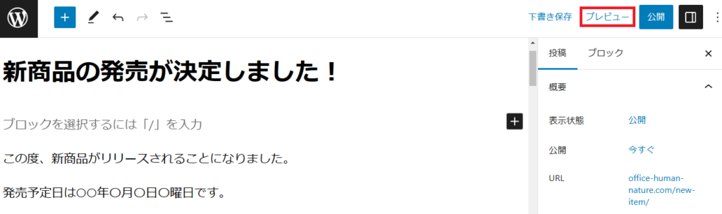 『プレビュー』で、実際にサイト上にどのように表示されるのか確認します。