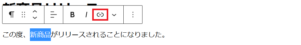 リンクを挿入する文字列を選択して、上図の赤枠内のボタンをクリックします。