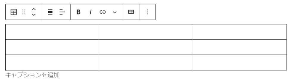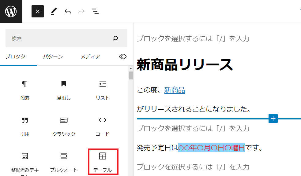 すると画面左カラムが表示されます。こちらはすべてのブロックが表示されます。その中にある『テーブル』をクリックします。