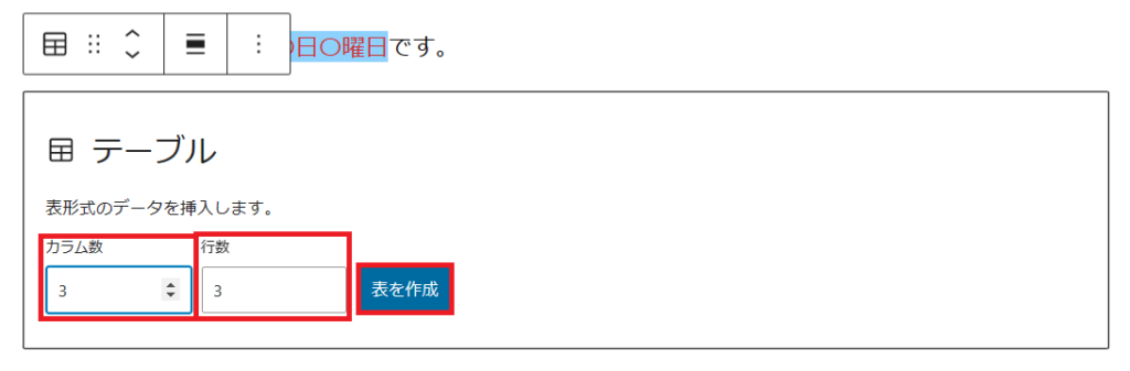上図のように表示されますので、『カラム数』『行数』を入力してから『表を作成』をクリックします。