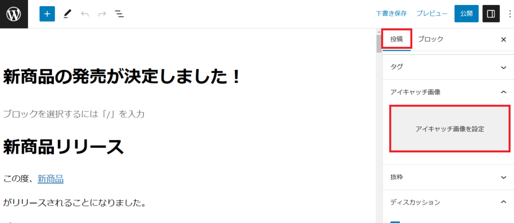 つぎは、『アイキャッチ画像』を設定してみましょう。