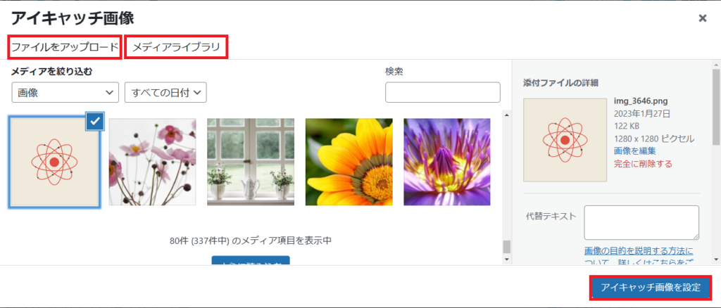 『ファイルをアップロード』か『メディアライブラリ』を選択して、保存されている画像をクリックします。さいごに右下の『アイキャッチ画像を設定』をクリックすれば完了です。