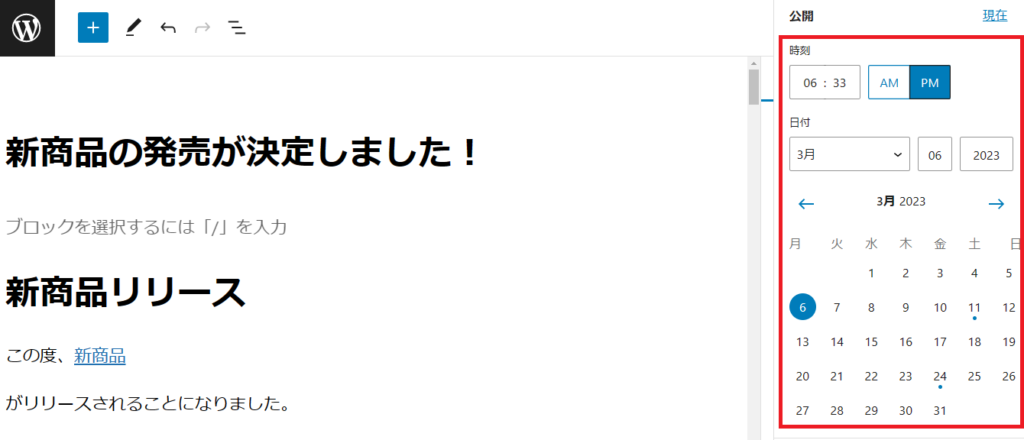 『公開:今すぐ』をクリックすると上図のように表示されます。公開したい日付・時刻を設定してから『公開』をクリックすれば予約投稿完了です。