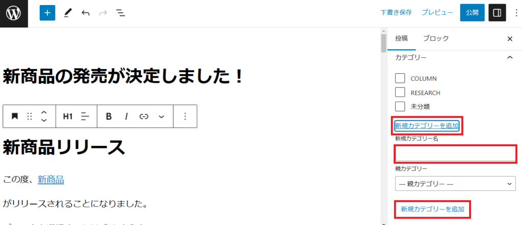 この手順であれば、新しくカテゴリーを追加した上で記事カテゴリーの設定もできます。