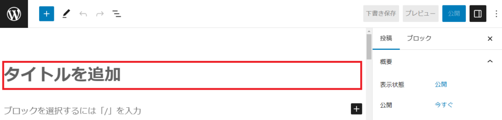 タイトル下のブロック『ブロックを選択するには「/」を入力』と書かれている箇所をクリックして本文を入力します。