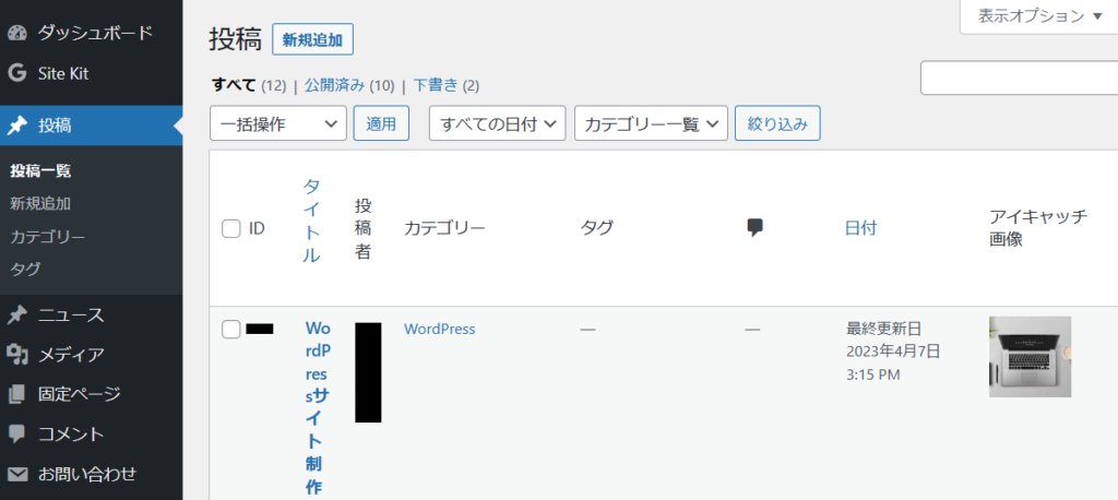 管理画面の『投稿』を開いて、『投稿一覧』をクリックします。すると、投稿記事の一覧表が表示されます。