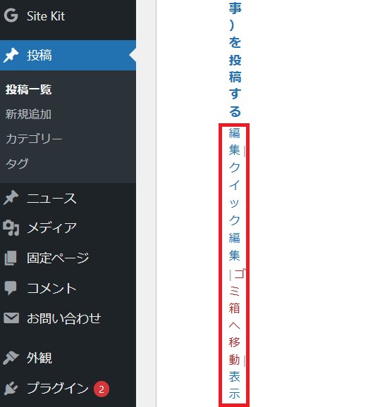 記事タイトルにカーソルを合わせると、記事タイトルの下に『編集』『クイック編集』『ゴミ箱へ移動』『表示』という項目が表示されますので『ゴミ箱へ移動する』をクリックします。