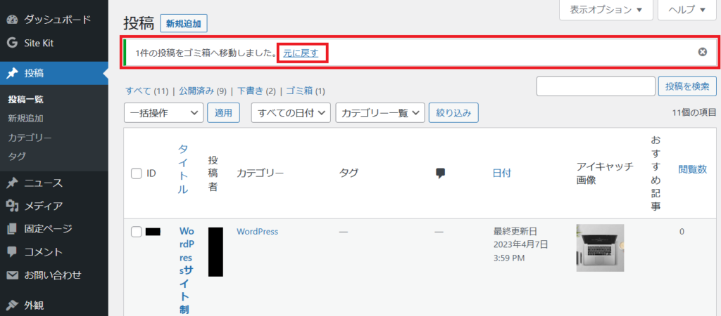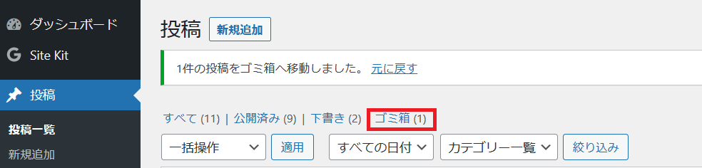すると上図のように「1件の投稿をゴミ箱へ移動しました。」と表示されます。もし間違えて『ゴミ箱へ移動』をしてしまった場合は、『元に戻す』をクリックすれば大丈夫です。