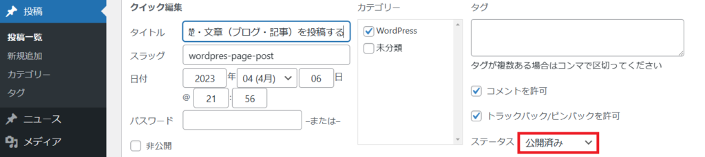 すると『クイック編集』の画面が開きます。ステータス『公開済み』をクリックします。