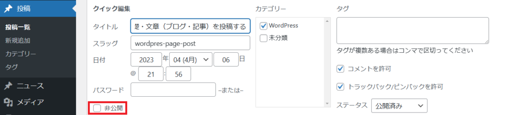 クイック編集画面が開きますので、『非公開』横の枠をクリックして☑を入れます。