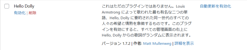 プラグインの「Hello Dolly」が、デフォルトでインストールされています。こちらはサイト運営上不要ですので、削除してしまいましょう。