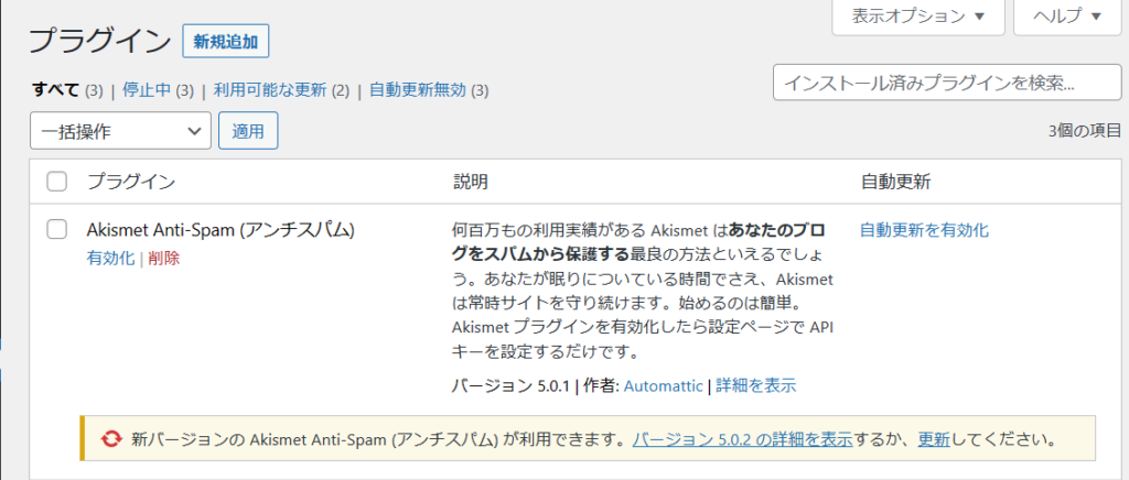 Akismetはコメントのスパム対策において高機能な、デフォルトでインストールされているプラグインです。ただ初期状態では「無効」となっていますので「有効」にする必要があります。
