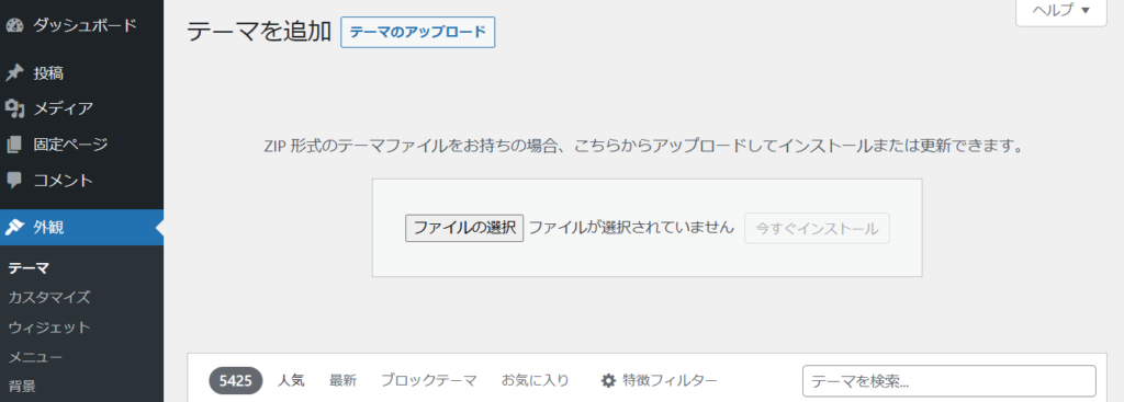 『テーマのアップロード』をクリックすると、上の画像のように表示されます。