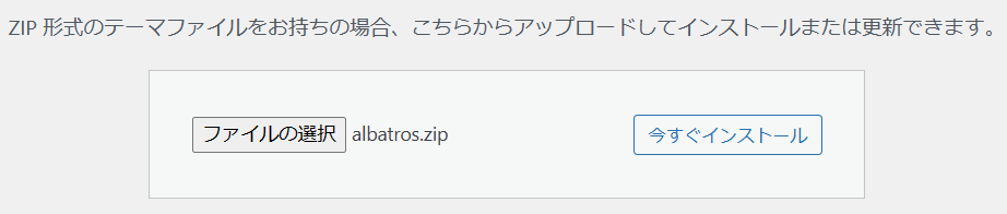 事前に購入してダウンロードしたWordPressテーマのファイルを『ファイルの選択』からアップロードします。