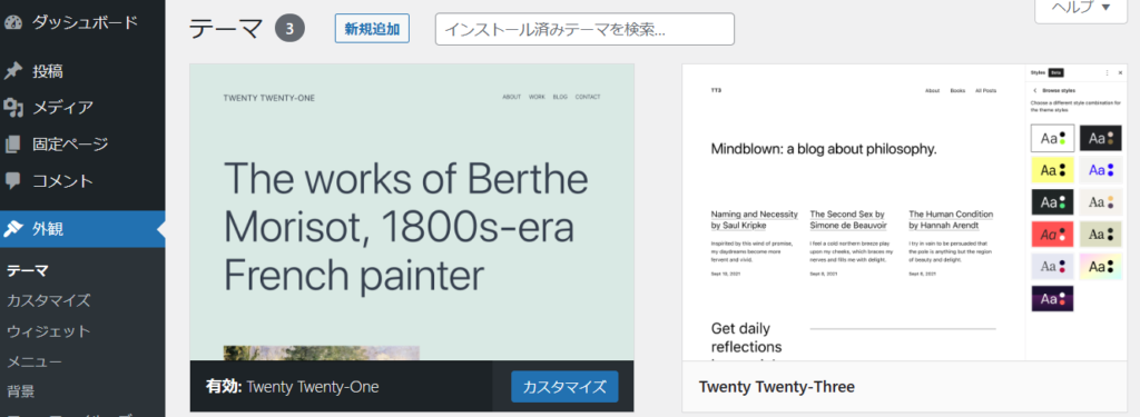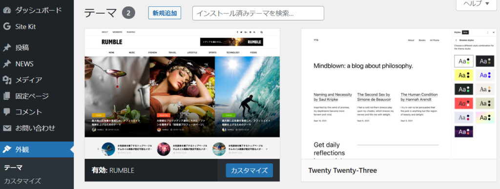 記事の冒頭でもお伝えしましたが、ダッシュボードの『外観』⇒『テーマ』と進んで、WordPressテーマを『インストール』して『有効化』することで完了します。
